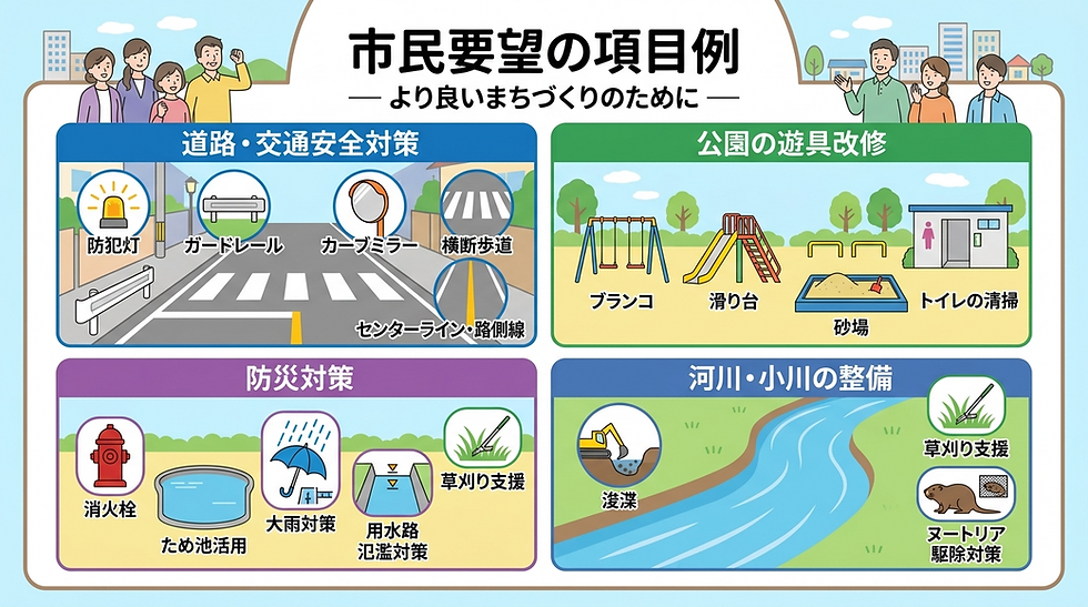 皆様から寄せられた声は、江津市の未来をつくる大切なタネです。議会での質問や行政への提言を通じ、早期実現に向けて全力で取り組んでまいります。